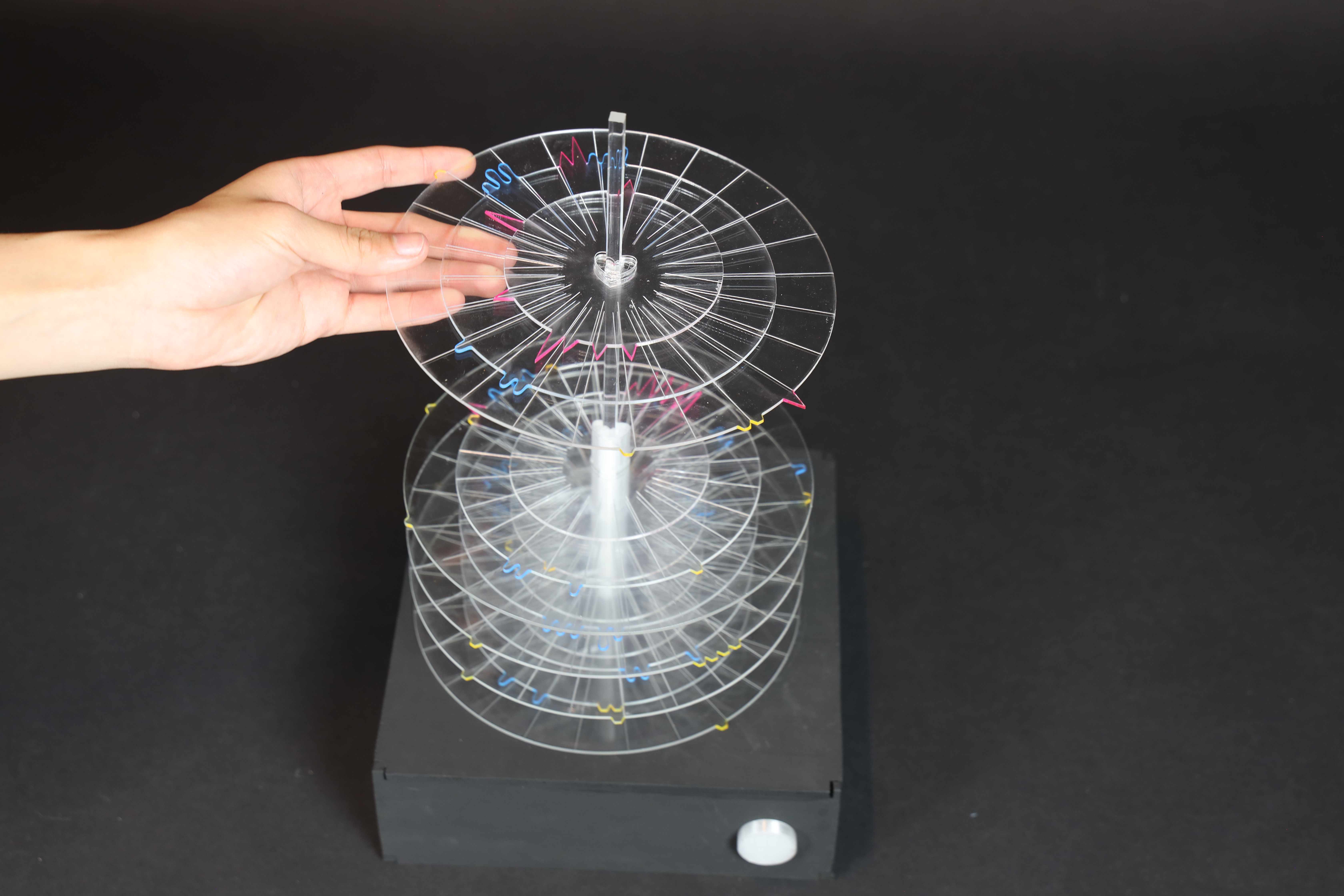 We laser-cut 8 discs from clear acrylic and stacked the concentric rings with vertical padding to leave a sizable free edge for the finger to touch. We used a heart shape for the padding as a directional marker to align all the discs to midnight so that we could visualize conversational patterns across days. The central acrylic rod's square cross-section helps spin the discs without slipping.